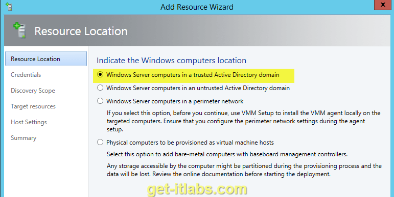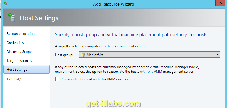 Fabric menüsü içerisinde Add Resources butonuna tıklıyoruz ve Hyper-V Host and Clusters linkine tıklıyoruz.