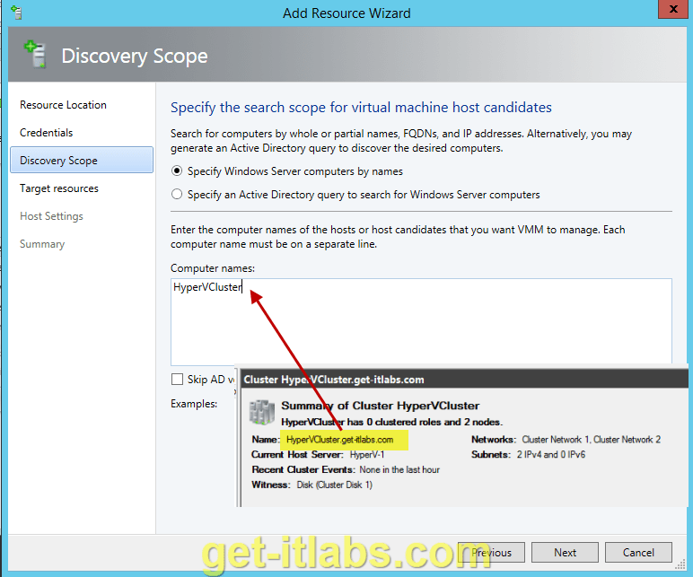 Computer Names bölümüne, Hyper-V Cluster adını, FQDN bilgisini, IP Adresini girebilirsiniz.