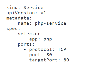 Aşağıdaki .yaml servis dosyası “php” selector’e sahip podların 80 TCP üzerinden hizmet vereceğini yani “expose” edileceğini belirlemektedir.
