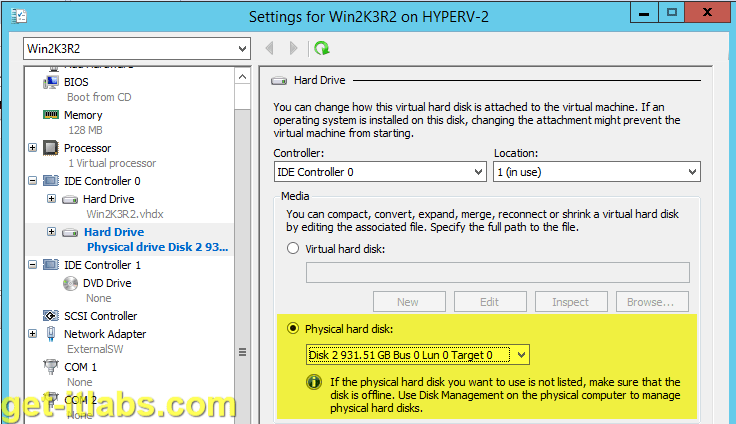 Hyper-V sanal sunucularda USB kullanım yöntemlerinden ikincisi olan bu yöntem, ilkine göre çok daha kolay ve amacına uygun hizmet etmektedir. Bu yöntemdeki kısıtlamalar ise sadece USB disklerin kullanımına imkan vermesidir. Bunun sebebi ise Flash belleklerin disk management yardımıyla offline mode ‘a çekilemiyor olmasıdır.