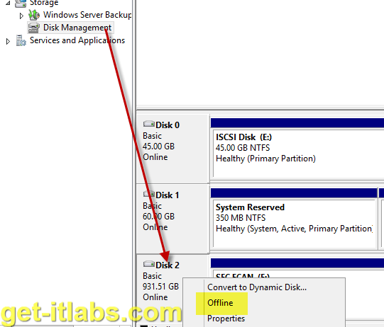 USB diskimizi, Hyper-V Fiziksel Sunucuya takıp Disk Manager ya da Powershell yardımıyla ilgili diski Offline mode getiriyoruz. Disk Management konsolundan, ilgili disk üzerinde sağ tıklayarak Offline seçeneğine tıklamamız yeterlidir.