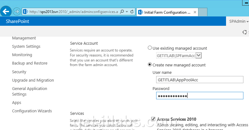 Burada Farm içerisinde uygulamalar ile ilgili ‘Create new managed account’ seçeneğini seçerek kullanıcı adına ‘AppPoolAcc’ ve ona ait şifreyi giriyoruz.