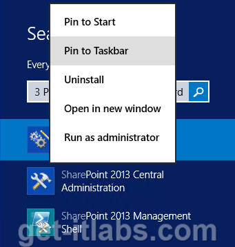 Ben ikinci yöntemle tekrar Central Administration sayfamızın açılışını yapacağım. Bunun için sunucumuzun ‘Başlat’ menüsüne sağ tıklayarak Search’e basmanız ve arama kutusunua Sharepoint yazmanız yeterli olacaktır. Bu çok fazla kullanacağımız bir sayfa olacağı için sayfamızı Taskbar’a yerleştiriyoruz.