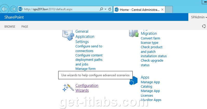 Ve Taskbar’dan Central Administration sayfamızı açıp en alt bölümde bulacağımız ‘Configuration Wizard’ linkine tıklıyoruz.