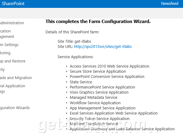 Ve sonrasında da sunucumuz Farm Konfigürasyonumuzun bittiğini söylüyor ve oluşturduğumuz sitemizin web adresini bize gösteriyor. Hemen altında da kurulan hizmetleri…