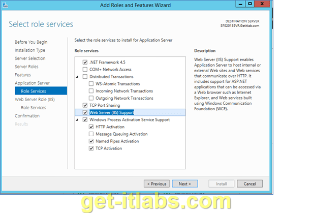 Açılan Role Services penceresinden ‘Windows Process Activation Service Support’, ‘HTTP Activation’, ‘Named Pipes Activation’, ‘TCP Activation’, ‘TCP Port Sharing’, ‘Web Server (IIS) Support’  ve ‘.NET Framework 4.5’ un kutucuklarının seçili olmasına dikkat ediyoruz. Bu arada otomatik açılan özellik ekleme pencerelerinde ‘Add Features’ a tıklamayı unutmayınız. ’Next’ ile ilerliyoruz.