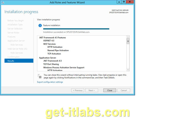 Kurulumun başarılı bir şekilde tamamlandığını gördükten sonra pencereyi ‘Close’ butonuna basarak istediğimiz rolleri ve özellikleri sunucumuza yükleme işlemini bitiriyoruz.