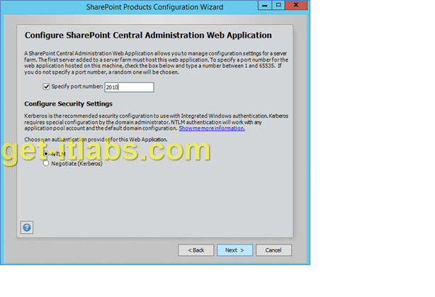 Central Administration için default olarak bir port numarası gelecektir fakat aklımızda kalacak bir port numarası vermek daha faydalı olacaktır. NTLM kimlik doğrulaması seçili olarak ‘Next’ ile ilerliyoruz.