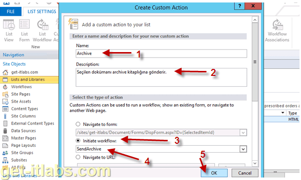 Butonumuzun adını ben “Archive” olarak girdim kısa tutmakta fayda var. Sonuçta Ribbon menü küçük bir yer. Açıklama girmenizde fayda var. Yapacağı fonksiyon için “Initiate Workflow” RadioButton’ını işaretliyoruz ve oluşturmuş olduğumuz “SendArchive” workflowunu seçiyoruz. Not: Eğer bu kısımda Workflow’unuzu göremiyorsanız, başından beri Sharepoint Designer’ınız açık kalmış bu nedenle de “Refresh” yapılmasına ihtiyaç var demektir.