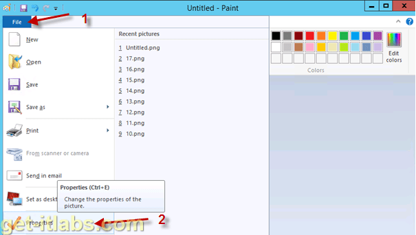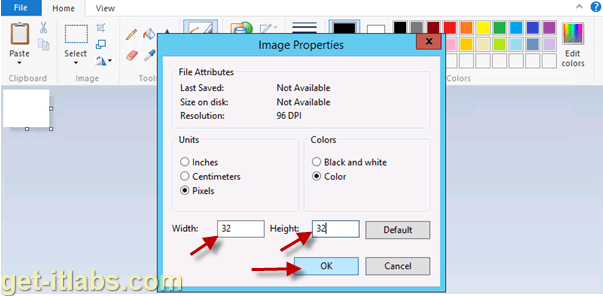 Paint programında “FILE” sekmesi altında “Properties” e tıklayarak butonumuzun ölçülerini girmemiz gerek.