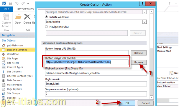 İlgili ayarların alt kısmında “Button image URL (32×32)” kısmında “Browse” yardımıyla “Site Assets” te kayıtlı bulunan “Archive.png” resmini seçiyoruz ve “OK” butonuna tıklıyoruz. Eğer bu kısımda da Archive.png adlı resim dosyanızı göremiyorsanız Sharepoint Designer’I “Refresh” ile yeniden başlatmanız gerekmektedir.