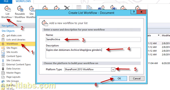 En büyük yardımcımız “Sharepoint Designer 2013” ile ana sitemizi açıp, “Workflows” linkine tıklıyoruz. Ribbon menu üzerinden “List Workflow” linkine tıklıyarak “Document” adlı kitaplığımızı seçiyoruz. Workflow adını “SendArchive”, açıklama bilgisini ve “Platform Type” kısımlarını doldurarak “OK” butonuna tıklıyoruz. Sharepoint 2013 Workflow Platform Type olarak göremiyorsanız nasıl ekleyeceğinizi görmek için tıklayınız.
