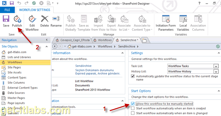 Ardından dosya yolundan “SendArchive” sekmesine tıklayarak aşağıdaki gibi önce workflowun elle başlatılmasını işaretliyoruz. Ve workflowu “Publish” ediyoruz.