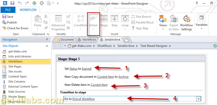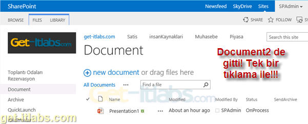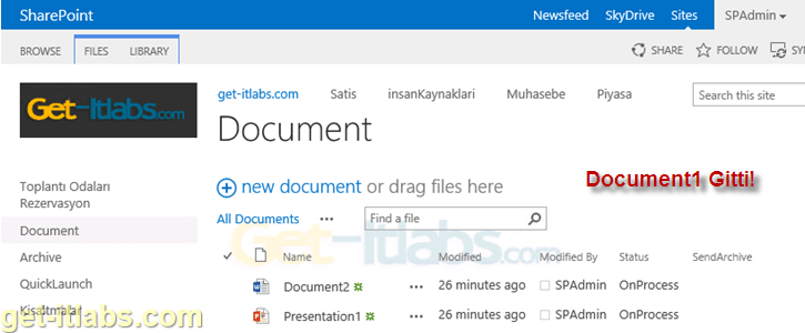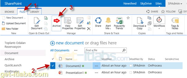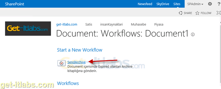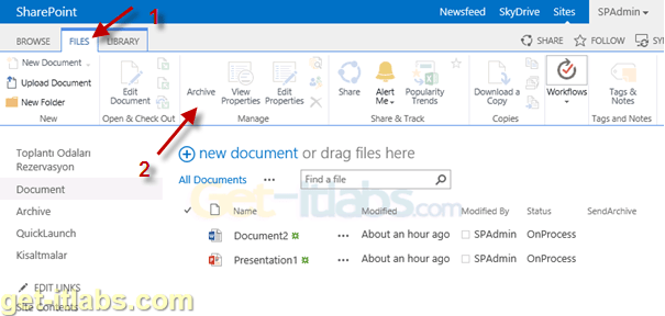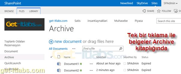 Get-itlabs.com sitemizde bir adet “Document” adlı bir doküman kitaplığımız mevcut. Bu kitaplığımıza “Status” adında bir kolon ekleyerek, buradaki belgelerin işlemde mi (onProcess) yoksa işlemi tamamlanmış (Expired) yani arşive gönderilmeye hazır mı olup olmadığını belirliyoruz. İşlemi tamamlanmış yani “Expired” olanların yine aynı sitede bulunan “Archive” adlı arşiv kitaplığımıza göndermek istiyoruz. Bunu bir workflow yardımıyla yapacağız. Fakat bu workflowun kullanıcılar tarafından işlemi tamamlanmış belgeler işaretlendikten sonra, elle çalıştırılarak seçilen dosyaların durumunu Expired yapıp, arşiv kitaplığımıza taşımak istiyoruz. Şimdi işlemleri baştan aşağı bir görelim.