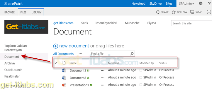 Aşağıda “Document” adlı kitaplığımızı görebilirsiniz. Varsayılan kolonların yanısıra “Status” adlı belgenin durumunu gösteren kolonumuzu da görebilirsiniz. Tabi Expired olan her doküman arşive gideceği için buradaki dokümanların hepsinin OnProcess yani işlemi devam eden olması gerekir.