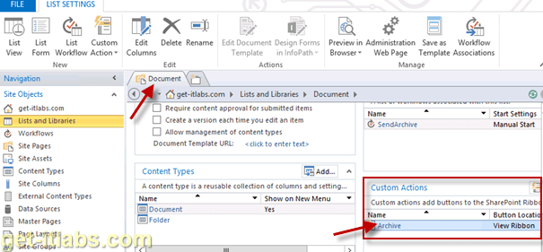 Sharepoint Designer ile “Document” adlı kitaplığımızın özelliklerinden “Custom Actions” başlığı altından oluşturmuş olduğumuz “Archive” butonuna çift tıklıyoruz.
