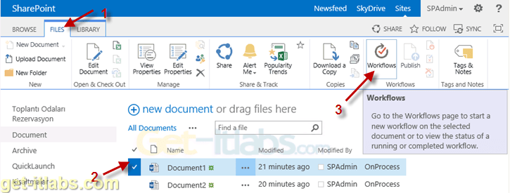 Artık workflow hazır olduğuna göre nasıl kullanacağımızı görelim. Öncelikle size uzun yolu göstereyim. “Document” kitaplığında “Document1” adlı dokümanı secerek, Ribbon menüden “FILES” sekmesi altında “Workflows” linkine tıklıyoruz.