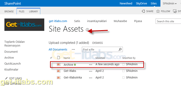 Sitemizde “Site Assets” kitaplığımıza “Archive.png” adlı resim dosyasını kaydettim.