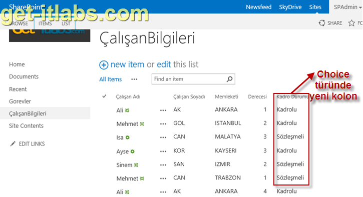 Öncelikle bir önceki makalemde de kullanmış olduğum listeme, “Choice” tipinde yeni bir “Kadro Durumu” adlı kolon ekledim. Bu kolonu neden eklediğimi makalemizin ilerleyen kısımlarında anlatacağım.