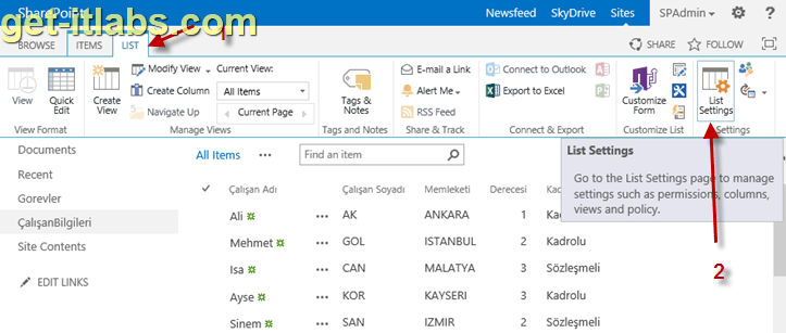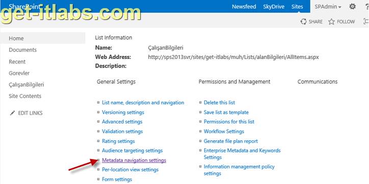 Artık “Metadata Navigation Settings” ayarlamaları için listemizde Ribbon menü üzerinde “LIST” sekmesi altında “List Settings” e tıklıyoruz.