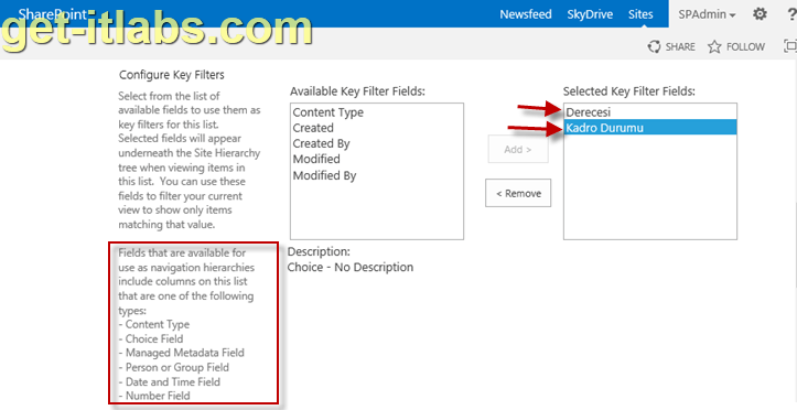 Aşağıya doğru ilerlediğimizde “Filtreleme Anahtarları-Key Filters” olarak kullanacağımız kolonları seçiyoruz. Buradan yukarıdakinden farklı olarak “Number- Rakam” , “Person or Group Field-Kişi ya da Grup Kolonu” ve “Date and Time Field-Tarih ve Saat Kolonu” da seçilebilecek kolonlar arasına girmiş durumda… Soldaki ingilizce açıklama da bize bunu anlatıyor. Bende “Number” türündeki “Derecesi” adlı kolonu da filtreleme anahtarı olarak ekliyorum.