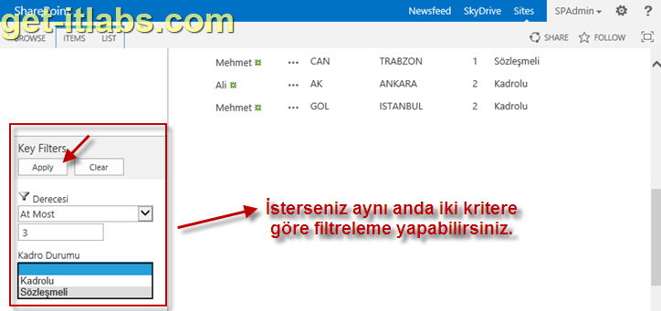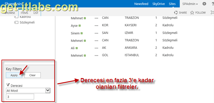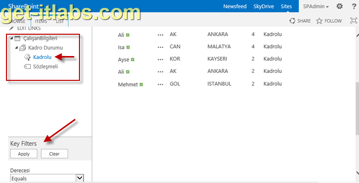 Artık listemize tıkladığımızda, Hızlı Başlat (Quick Launch) menünün hemen altında, “Kadro Durumu” na göre metadata navigasyonu, Derecesi ve Kadro durumuna göre de filtreleme yapabildiğimi görebiliyorum. Bu yeni gelen navigasyon sadece ilgili liste üzerindeyken görünür diğer sayfalarda görünmez. Aşağıdaki örnekte Kadrolu metadatasını seçtiğim için sadece kadrolu personel görünmekte.