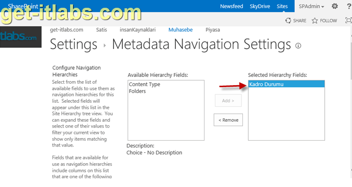 Sol taraftaki ingilizce açıklamaları okuduğumuz zaman anlıyoruz ki, bu kısımda sadece “Content Type (İçerik Türü-Library için çok kullanışlı bir yapıdır.), Single-value Choice Field (Tek değer alabilen çoktan seçmeli kolonlar) ve Managed Metadata Field (Daha önceden belirlediğimiz kurumsal terimler-Managed Metadata makalemiz için tıklayabilirsiniz.) türleri gösterilmektedir. Bende örneğimize yardımcı olması açısından, başlangıçta nedenini bu kısımda açıklayacağımı söylediğim Kadro Durumu adlı “Choice” türünde bir kolon ekledim.
