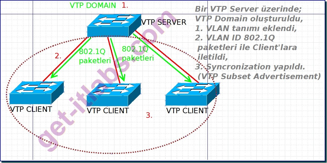 VTP Advertisement Dağıtımı: VTP Server ve Client olarak tanımlanmış olan Switch’ler normal olarak VTP Advertisement’larını yapar ve vlan database’lerini güncellerler. VTP Transparent olarak ayarlanmış olan Switch’ler ise vlan database’ini güncellemez sadece VTP advertisement’larını trunk portundan iletir. Tüm switch’lerin tüm VLAN ID’lerini öğrenmesi işlemine syncronization adı verirlir.