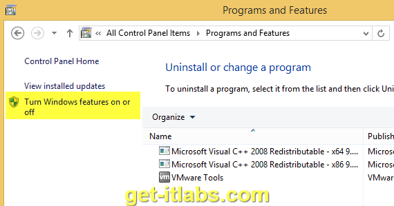 Windows 8 işletim sistemine sahip bilgisayarımızda kontrol panele giriyoruz, Programs and Features penceresinden “Turn Windows features on or of” menüsünü açıyoruz.
