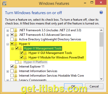 Hyper-V menüsü altındaki Management Tools paketini yüklüyoruz.