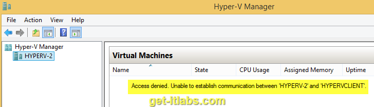 Evet konsola erişimi sağlayabildik fakat bu seferde “Access Denied. Unable to establish communication between Hyper-V and Client” hatası ile karşılaşabiliriz.