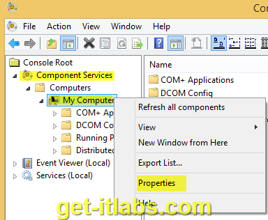 Component Services – Computers – My Computer üzerinde sağ tıklıyoruz ve Properties penceresini açıyoruz.