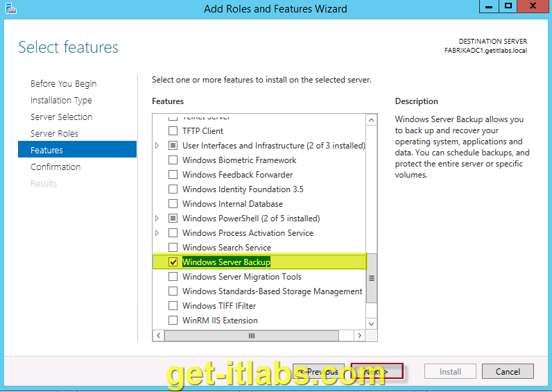 2. Features ekleme penceresine kadar Next ile ilerleyiyoruz ve Features penceresinden Windows Server Backup seçeneğiniz seçiyoruz.