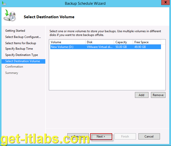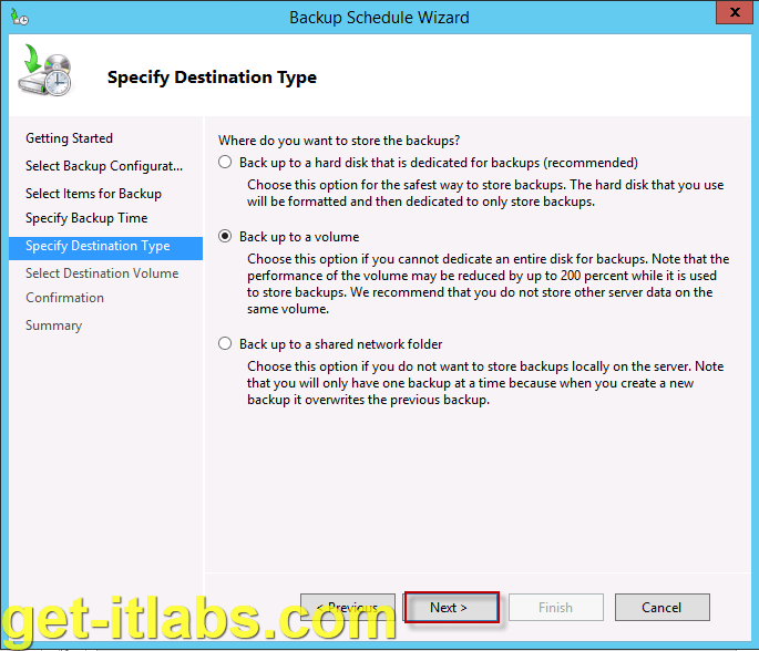 Uygun bir Backup Lokasyon türü seçiyoruz. “Backup to Hard disk” seçeneği sadece yedekleme işlemi için ayrılmış ikinci bir diskiniz var ise seçilebilir. Eğer network üzerindeki paylaştırılmış bir alana yedek aldırmak isterseniz “Backup to shared folder” seçeneğini seçmelisiniz. Eğer sunucu üzerindeki başka bir amaç içinde kullanılan diske yedek aldırmak istiyorsanız “Backup to a Volume” seçeneğini seçmelisiniz.