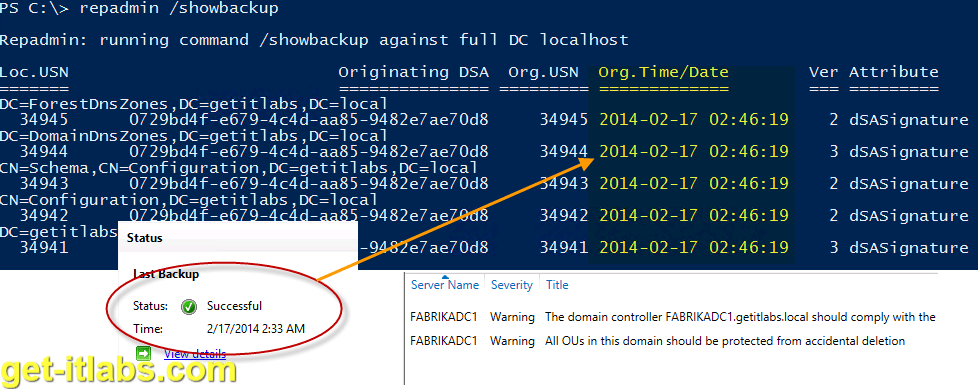 Yedekleme işlemi sonrası BPA penceresinden uyarı mesajlarının silindiğini görebiliriz. “Repadmin /showbackup “ komutu ise yedek alınan son tarihi bize gösterecektir.