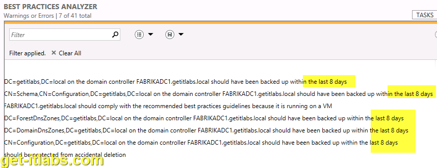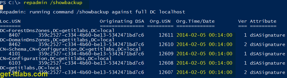 Active Directory Backuplarının alınmadığında Active Directory Best Practise Analayzer bizi uyarır. Yada biz kendimiz en son yedek alım tarihini repadmin /showbackup komutu ile öğrenebiliriz.
