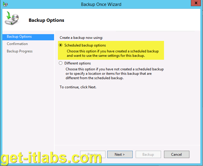 Bu görevi hemen çalıştırmak istersek Backup Once seçeneğine tıklayıp Scheduled Backup Options seçeneğini seçebiliriz.