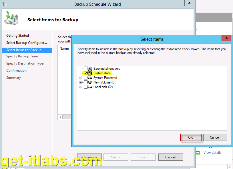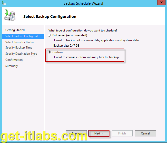 Sunucunun imajı olarak tabir ettiğimiz o anki anlık görüntüsü almak istersek Full Backup seçeneğini seçebiliriz. Bu seçenek terminolojide Bare Metal Restore olarak adlandırılmaktadır. Biz Custom seçeneği ile sadece System State yedeğini seçiyoruz.