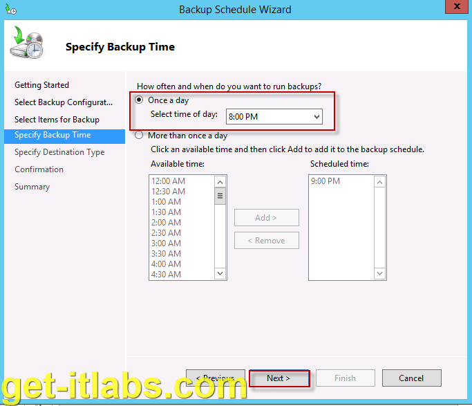 Yedekleme işlemleri için network trafiğinin az olduğu zaman dilimleri seçilmelidir. Eğer Active Directory nesneleriniz gün içerisinde oldukça fazla değişiyor ise günde birden fazla yedek aldırmak gerekebilir. Bu durumda “More than once a day” seçenğini seçebilirsiniz.